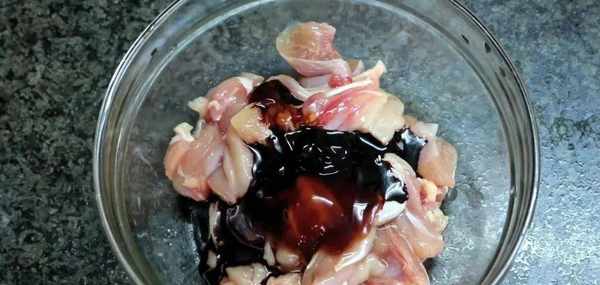 2、準備一碗雞腿肉,倒入生抽、蠔油、胡椒粉,用勺子攪拌均勻,香菇洗凈後切片,蝦仁煮熟後切碎,臘腸同樣切片備用。