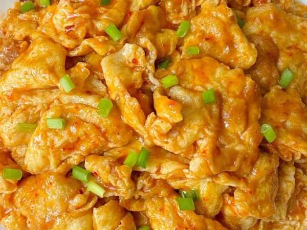 3、最後放入魚片翻炒均勻,炒入味後撒上蔥花即可出鍋裝盤開吃。