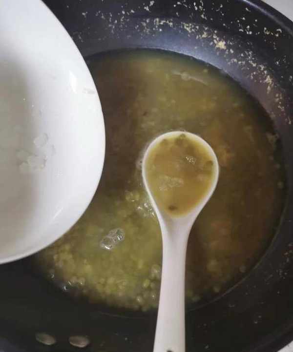 5根據個人喜好放入糖,黃冰糖和小冰糖都行,不要放太多,根據綠豆湯量的多少,酌情放入。