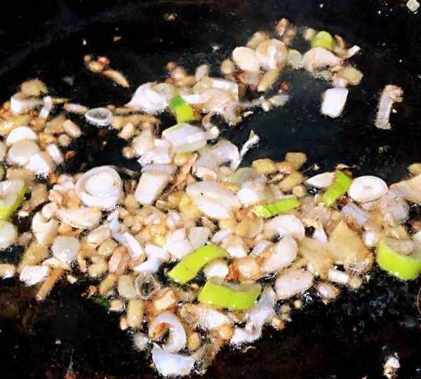 第7步、鍋中倒入底油加熱放入蔥薑蒜爆香。