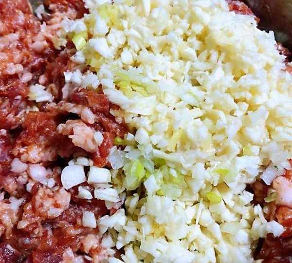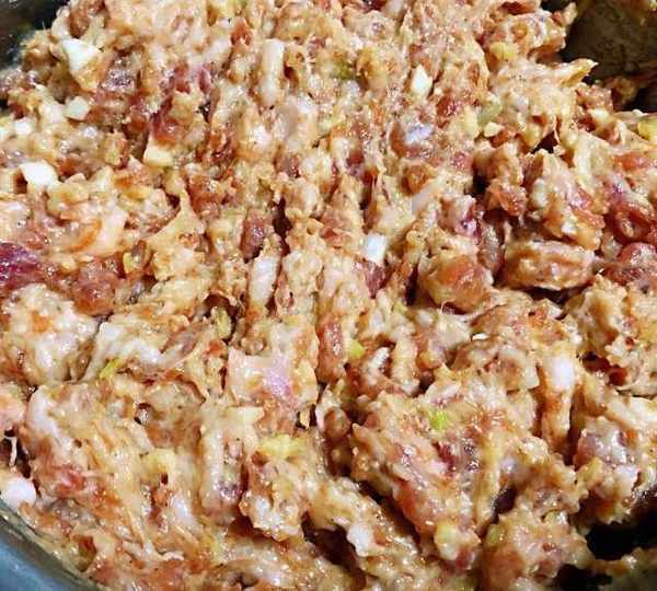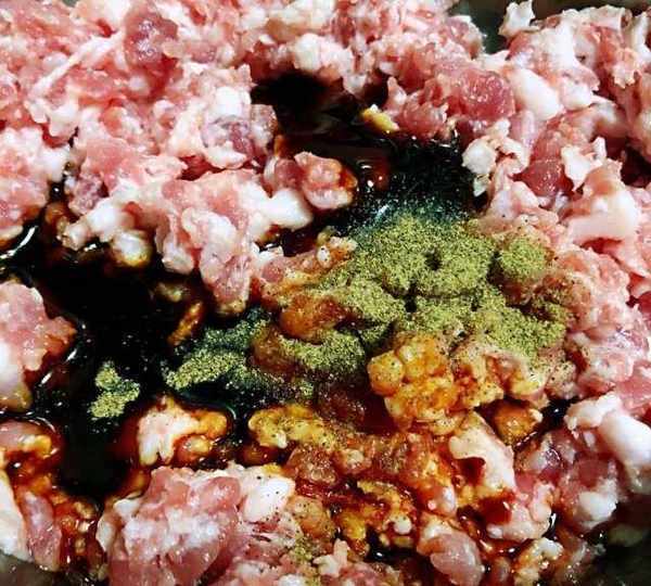 第1步、新鮮的豬肉餡放入一品鮮醬油、蠔油、黑胡椒粉拌勻。
