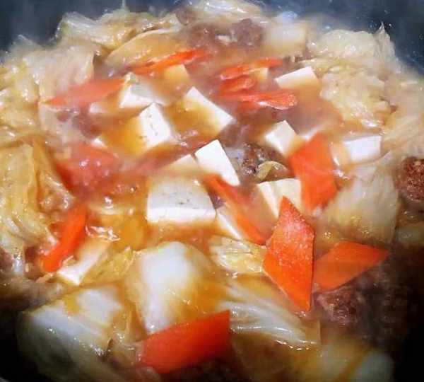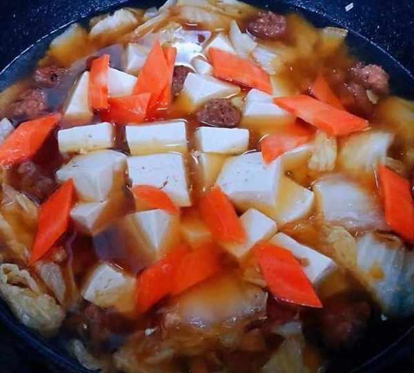 第10步、放入豆腐和胡蘿卜再添加適量清水大火燉起來。