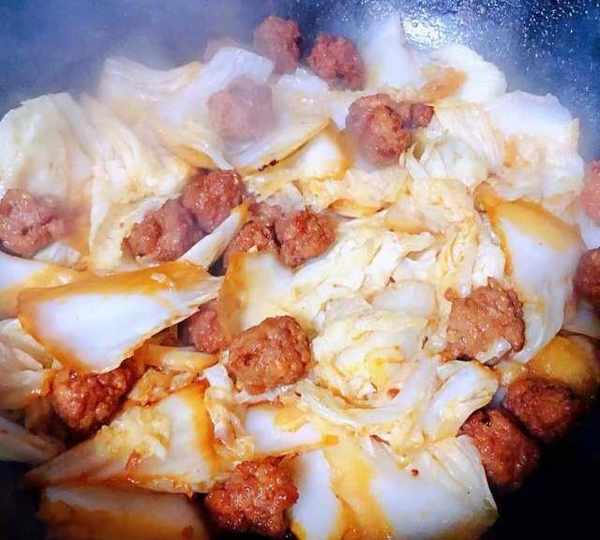 第9步、放入這道菜的靈魂配料肉丸炒勻。