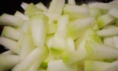 第五步:倒入夏瓜,攪拌均勻,倒入準備好的醬汁,攪拌均勻,蓋上鍋蓋將冬瓜煮熟。