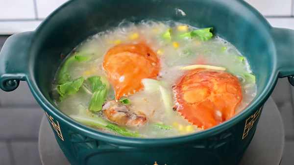 7.加入玉米粒,大火燒開,加入煎好的梭子蟹