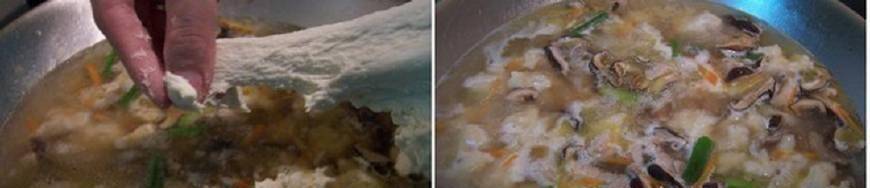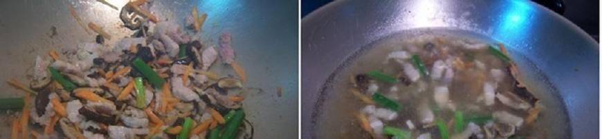 加入香菇、豬肉、大蔥、胡蘿卜、豬肉和白胡椒粉炒香,然後加水燒開。