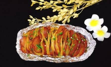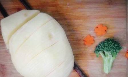 土豆底下墊兩隻筷子,切成薄片。底下不要切斷。但也不要隻切到一半,因為後面烤的時候土豆底部不愛熟
