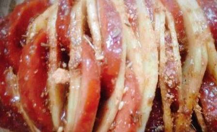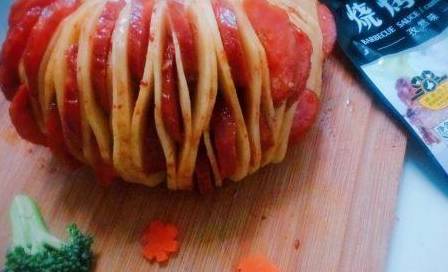 醃個十分鐘左右,再把土豆底部沒切段的地方再刷一層燒烤醬