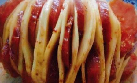 最好是一片土豆夾一片腸。如果刀工像我一樣,土豆和腸切的片厚,也可以兩片土豆夾一片腸。這個隨意就行