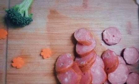 哈爾濱紅腸切薄片,也可以換成培根,或者其他的腸,熏肉