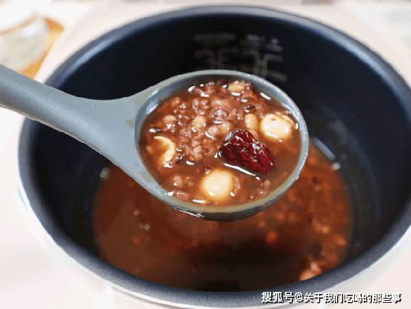 2、把所有的食材都放進電飯鍋裡,加入適量清水,選擇煮粥功能,1個半小時後加入適量紅糖攪拌均勻,即可食用。