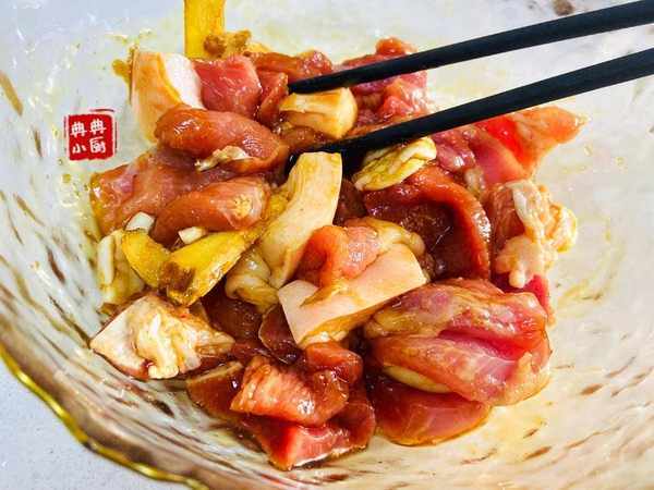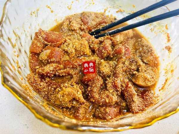醃制好之後,我一般會把薑蒜挑出來不要,孩子不愛吃,醃制的時間裡薑蒜味已經進入肉裡面瞭。加入米粉,我是超市買的現成的米粉,我試過很多次瞭,就是那種最便宜的反而最好吃。