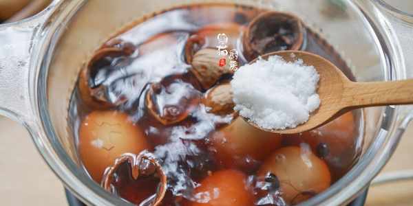 5.把敲裂的雞蛋放入鍋裡,小火煮6-7分鐘左右,需要加點食鹽以及生抽醬油調味,醬油是為瞭讓雞蛋更好地上色,而食鹽除瞭起調味作用以外也相當於藥引子的作用,能讓核桃煮雞蛋的固腎作用更好。
