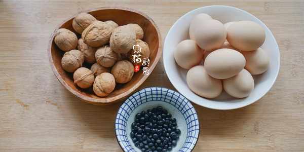 核桃8-10個,雞蛋12個,黑豆1把,鹽少許。