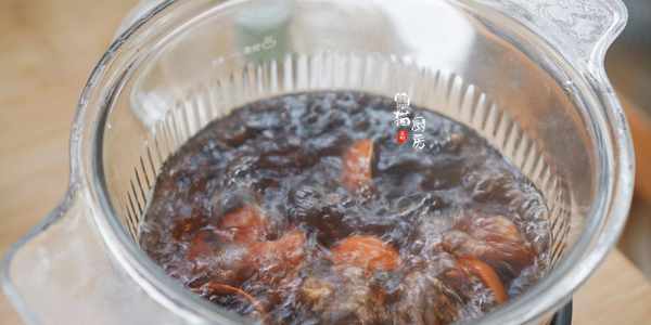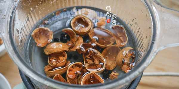 4.泡過的核桃殼和黑豆小火煮30-40分鐘,能看到鍋裡的核桃黑豆水顏色會變深,變成深棕紅色。
