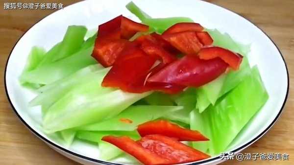 1.首先萵筍去皮,改刀切馬蹄段,然後再切成菱形片,全部切好裝盤備用。