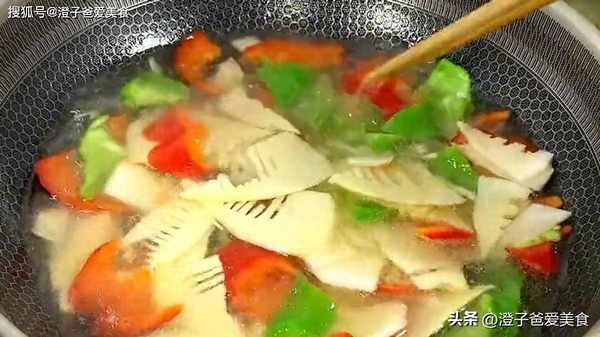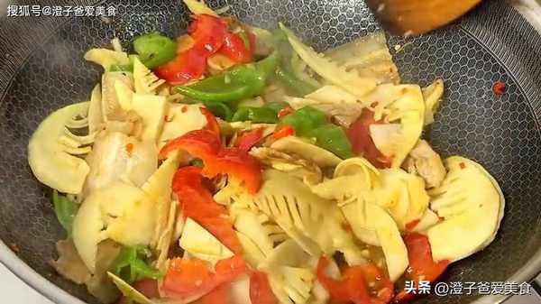 5.炒出紅油之後放入竹筍、青紅椒,繼續翻炒均勻,調味放一小勺食鹽,一小勺雞精,一小勺糖,淋上少許的生抽,再倒入水淀粉,翻炒炒兩分鐘後就可以出鍋瞭。