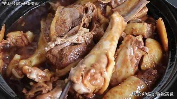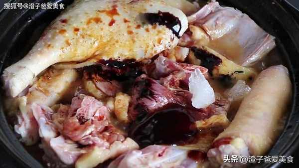 4.時間到瞭,翻動一下,加入半勺麥芽糖,倒入半斤紅酒或黃酒,放幾粒冰糖、生抽、老抽上色、蠔油、適量的鹽,攪拌均勻,小火再煮30分鐘慢慢收汁,