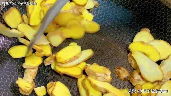 2.今天的主角是老薑,半斤老薑洗幹凈不用去皮切厚片,不能太薄瞭,直接放鍋裡面炒幹水分。