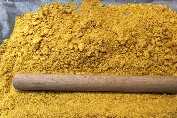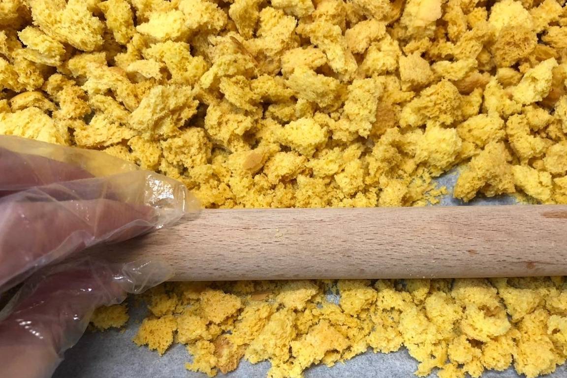 4、用搟面杖把吐司給搟碎,也可以用這樣的搗蒜器給搗碎瞭。