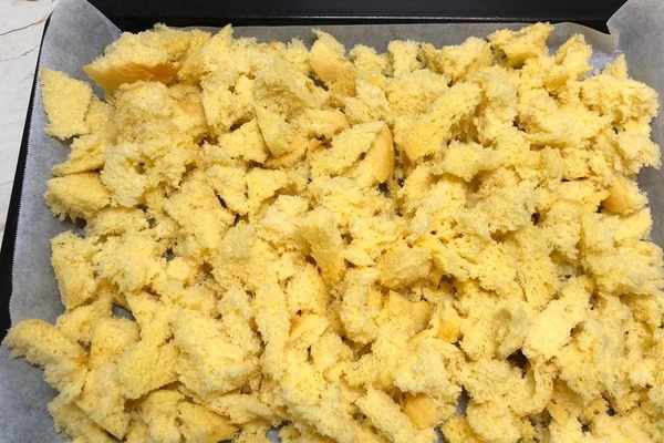 3、大傢要是覺得用烤箱烤有點麻煩的話,大傢還可以把面包放進冰箱裡面凍一個晚上,這樣面包就是硬硬的瞭,然後再用搟面杖把面包搟碎,不過這個辦法容易回潮,建議大傢還是用烤箱烤來的方便一些。
