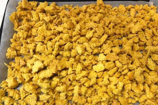 1、為瞭讓面包糠是金黃色的,所以這裡面我就用瞭南瓜吐司,或者是面包都可以。為瞭做出來的顏值能夠更加的高,建議大傢還是用這樣帶有黃顏色的吐司或者是面包來做最好,這樣也能隨便幫助我們解決吃不瞭吐司的問題。烤箱調制100度,用熱風烘烤1~2小時,期間也要註意多次給吐司翻面。