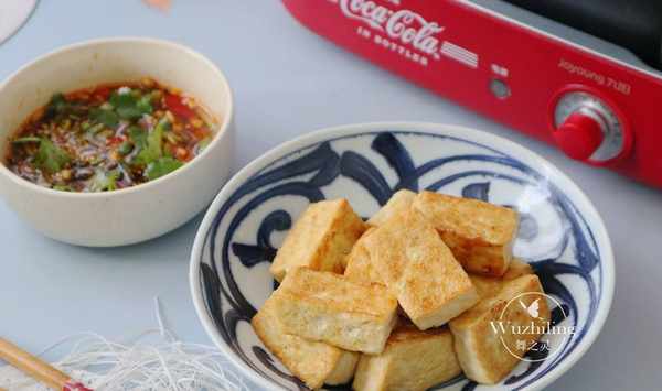 第三步:將多功能燒熱,然後薄薄刷一層油,然後將瀝幹水分的鹵水豆腐放入煎,各個面都煎定型微黃狀態,最後放入澆汁中浸泡片刻吃,爆汁的感覺,太開胃瞭。