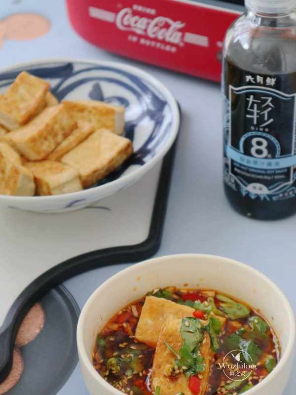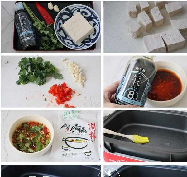 準備材料:鹵水豆腐,香菜,小辣椒,蒜和六月鮮8克輕鹽醬油,還有就是少許的麻辣香鍋粉
