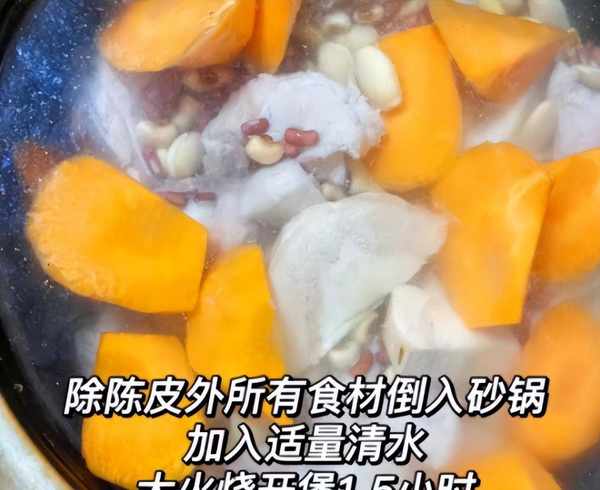 步驟6:準備好一個燉湯的鍋,鍋中依次放入胡蘿卜,豬骨,陳皮,扁豆,眉豆和赤小豆,放入一些薑片,加上足量的純凈水,開大火煲一個小時。