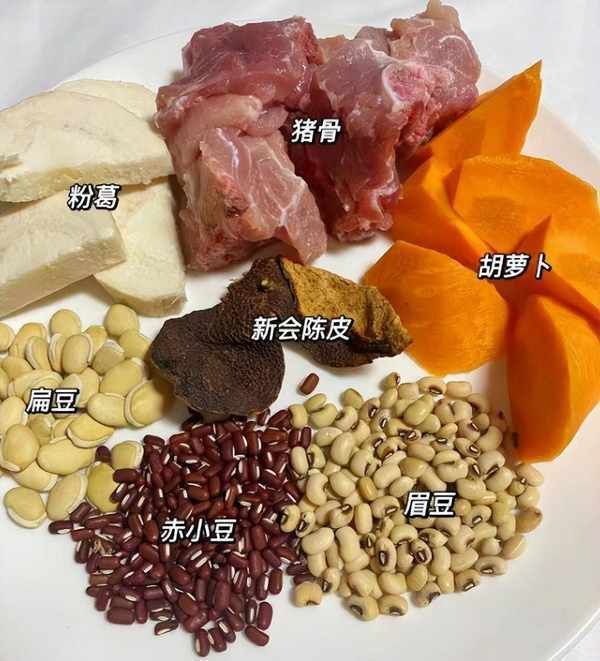 食材清單:挑選新鮮豬骨320克左右(豬骨是一種很常見的食材,許多人喜歡用來煲湯,豬骨湯燉出來湯鮮味美,營養非常出色,補充能量,促進骨骼發育,好處多多),選購胡蘿卜2個,粉葛少許,陳皮2片,扁豆30克左右,赤小豆一小把,眉豆30克左右,冷水少許,溫水足量,純凈水少許,一大塊生薑,適量料酒,一丟丟食鹽,半勺胡椒粉,香蔥或大蔥少許,其他調味品。