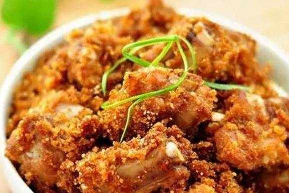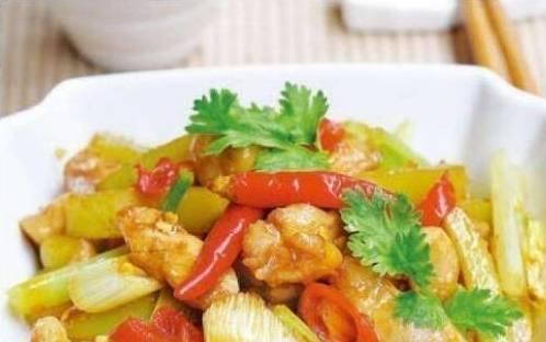 2、雞腿去骨,切小塊,在熱油裡炸熟至金黃色。