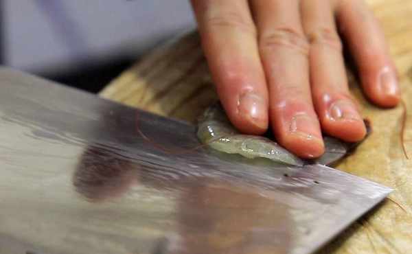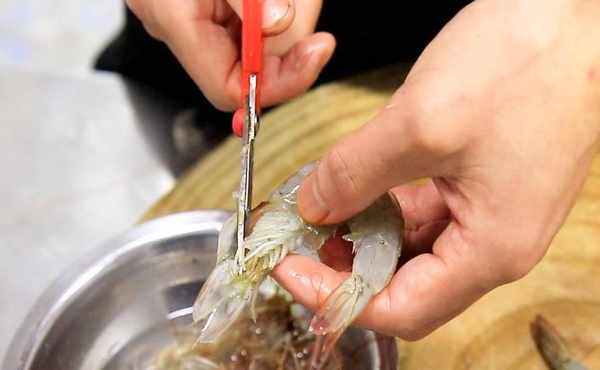 剪去蝦槍、蝦須、蝦腳,以免影響口感和賣相,去除蝦頭裡面的黑包,黑包是蝦的胃,雜質比較多。