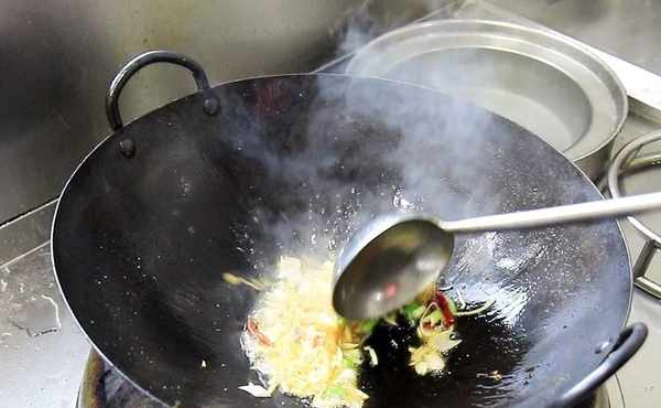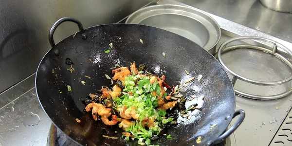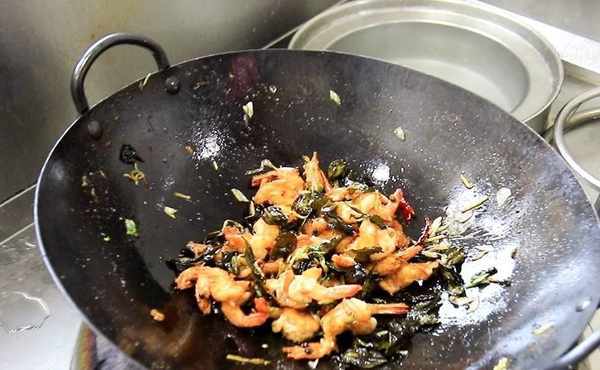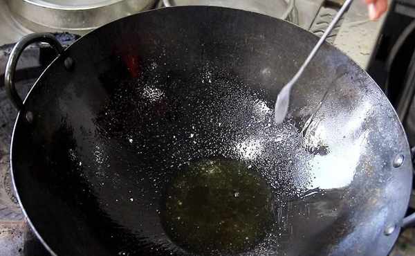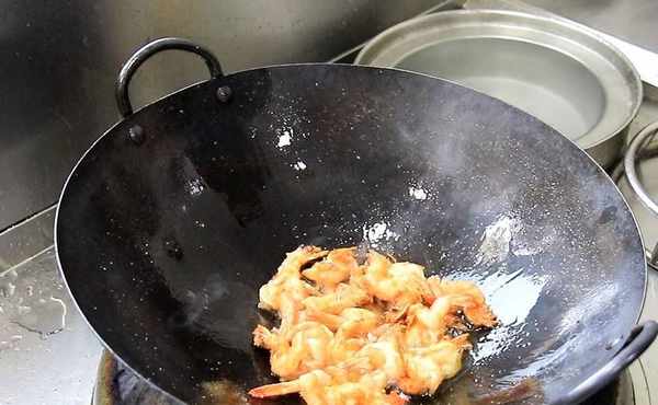 鍋內燒油,充分滑鍋以後,倒出熱油,多加一些涼油,在鍋底撒入少許食鹽,熱鍋涼油和撒食鹽,都是為瞭防止煎蝦時粘鍋。