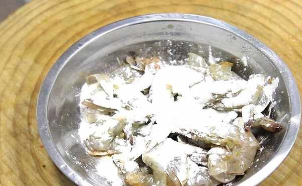 再撒入一小把幹淀粉,讓大蝦均勻裹上淀粉,醃制10分鐘,淀粉能鎖住蝦內部的水分,保持鮮嫩的口感。