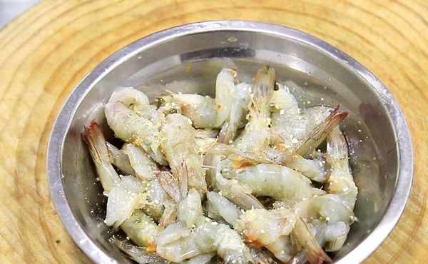 盆中加入食鹽1克,雞精1克,料酒5克去腥,抓拌至大蝦把料汁全部吸收。
