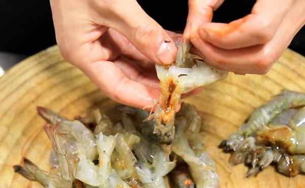 準備大蝦500克,把蝦處理一下,劃開蝦背,下刀要偏一些以免劃斷蝦線,改好刀之後,用牙簽挑出蝦線。