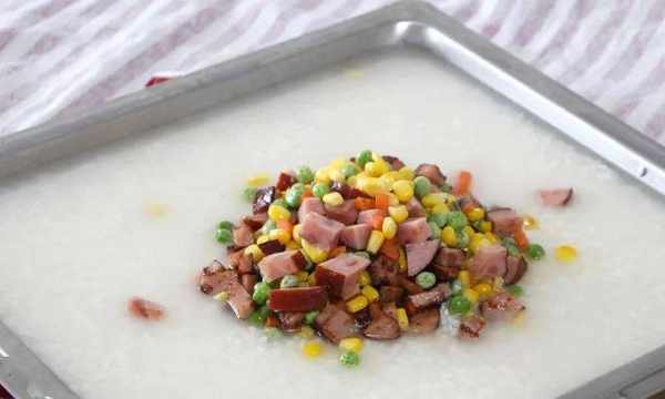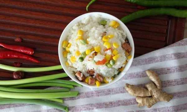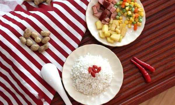 食材:玉米粒、豌豆、胡蘿卜、火腿、土豆、糯米(可根據自己口味選擇食材)
