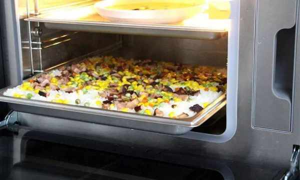 2、打開康內蒸烤一體款集成灶,將火腿放入鍋中翻炒幾下。