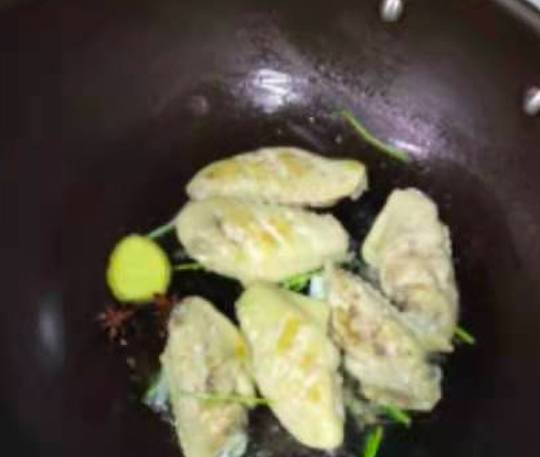 炒鍋預熱加少許油。雞翅下鍋小火煎至兩面焦黃~