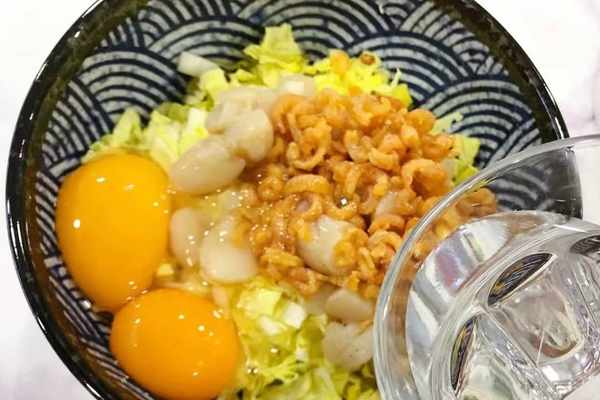 【烹飪食材】:娃娃菜一顆、鴨蛋兩個、金鉤海米一把、鮮貝丁適量、鹽適量、麻油少許