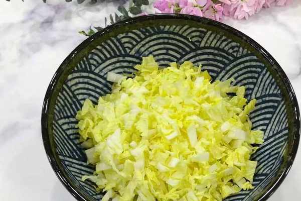 5、娃娃菜洗凈,控幹水分,隻取娃娃菜的葉子,剁碎備用。