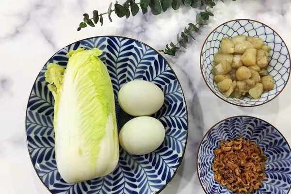 1、首先準備好要用的全部食材,新鮮的鮮貝丁還有一顆娃娃菜,還有兩個鴨蛋和適量的海米。