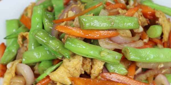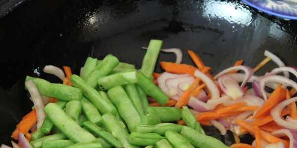 4、接下來,我們要將其他需要用到的菜料炒制一下。接下來我們往鍋中放入洋蔥圈,胡蘿卜絲,翻炒一下。在稍稍翻炒一下洋蔥和胡蘿卜,讓兩種食材斷生後,把前面炸好的豆角加進去,再翻炒一下。