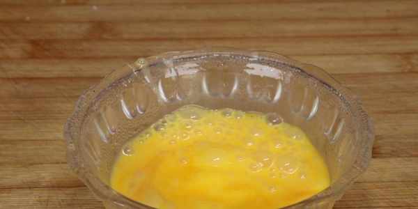 3、接下來,我們要炒制雞蛋碎。將鍋中炸過豆角的油倒出一些,為鍋中保留底油,然後倒入打好的雞蛋液,炒熟。炒制雞蛋的過程中用鏟子將雞蛋鏟成雞蛋碎,炒雞蛋的時候不要時間太長,時間太長的話雞蛋就炒老瞭,在雞蛋完全炒熟後,盛出來裝碗備用。