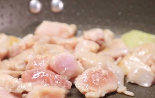 第三步:鍋中加入適量的油,五成油溫放入薑片爆香,隨後把醃制好的雞塊倒入鍋中,翻炒至周身泛白。