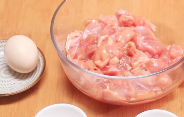 第一步:首先給雞腿進行一個脫骨處理,切成小塊之後放入一個大碗中,加入準備好的雞蛋清,一勺半的料酒,半勺生抽,1g食用鹽,10克淀粉,均勻攪拌醃制15分鐘。