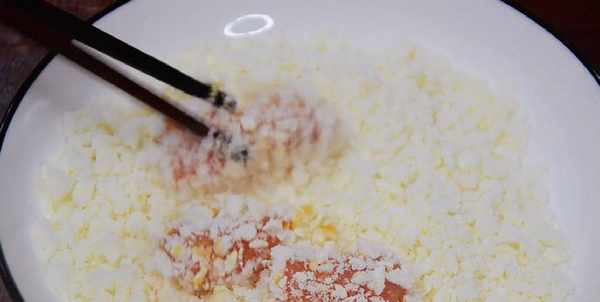 3、我們再準備一個饅頭,把饅頭的外皮去掉,隻要裡面的饅頭肉。用刀切成薄片,盡量切薄一些,改刀切成細條,最後再切成丁,可以用手捏得碎一些,裝入一個盤子中。大傢有面包糠的話也可以用面包糠,不過還是饅頭更香哦。接下來在新的小盤子中倒入適量的玉米淀粉,還有大多一碗新的雞蛋液都留著備用。這時雞胸肉醃制得差不多啦,我們夾出一塊雞胸肉,放在玉米淀粉中打滾,讓其表面都把淀粉裹上。夾出再放入蛋液吸下汁,讓蛋液均勻地包滿雞肉塊。最後放在饅頭屑裡,沾上一圈。所有的雞胸肉塊都是這樣的重復動作。