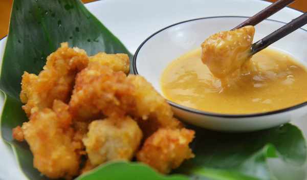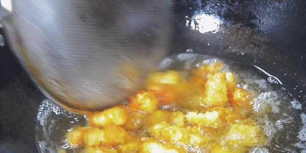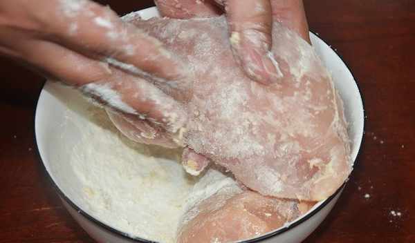 4、全部弄好之後,我們放在盤子裡備用,這時候我們開始燒鍋放油,油要放多一些。開大火將油燒熱,當我們把筷子搓進油中,周邊能快速起泡,證明油溫已經非常合適瞭。調到小火,把雞胸肉一塊一塊放入熱油中,炸至微微金黃時控油撈出,將它們放涼。鍋裡的油要濾掉殘渣,重新起鍋燒油,這時要用大火,將炸過的雞胸肉再倒進油鍋中回鍋一下。這樣炸出來的肉塊才會外焦裡嫩。