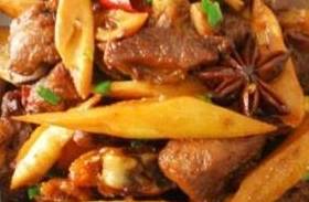 4、放竹筍塊兒,轉中小火,上十分鐘有大火收汁出鍋,裝盤即可食用。