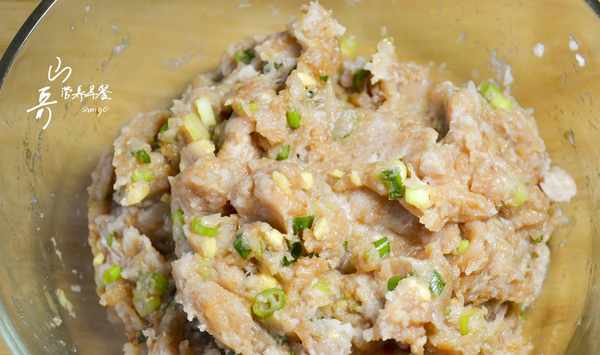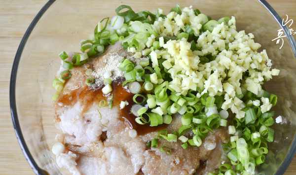 5.然後我們在餡料裡面加入食鹽、胡椒粉、蠔油、料酒、醬油攪拌均勻,我們的餡兒料就做好瞭